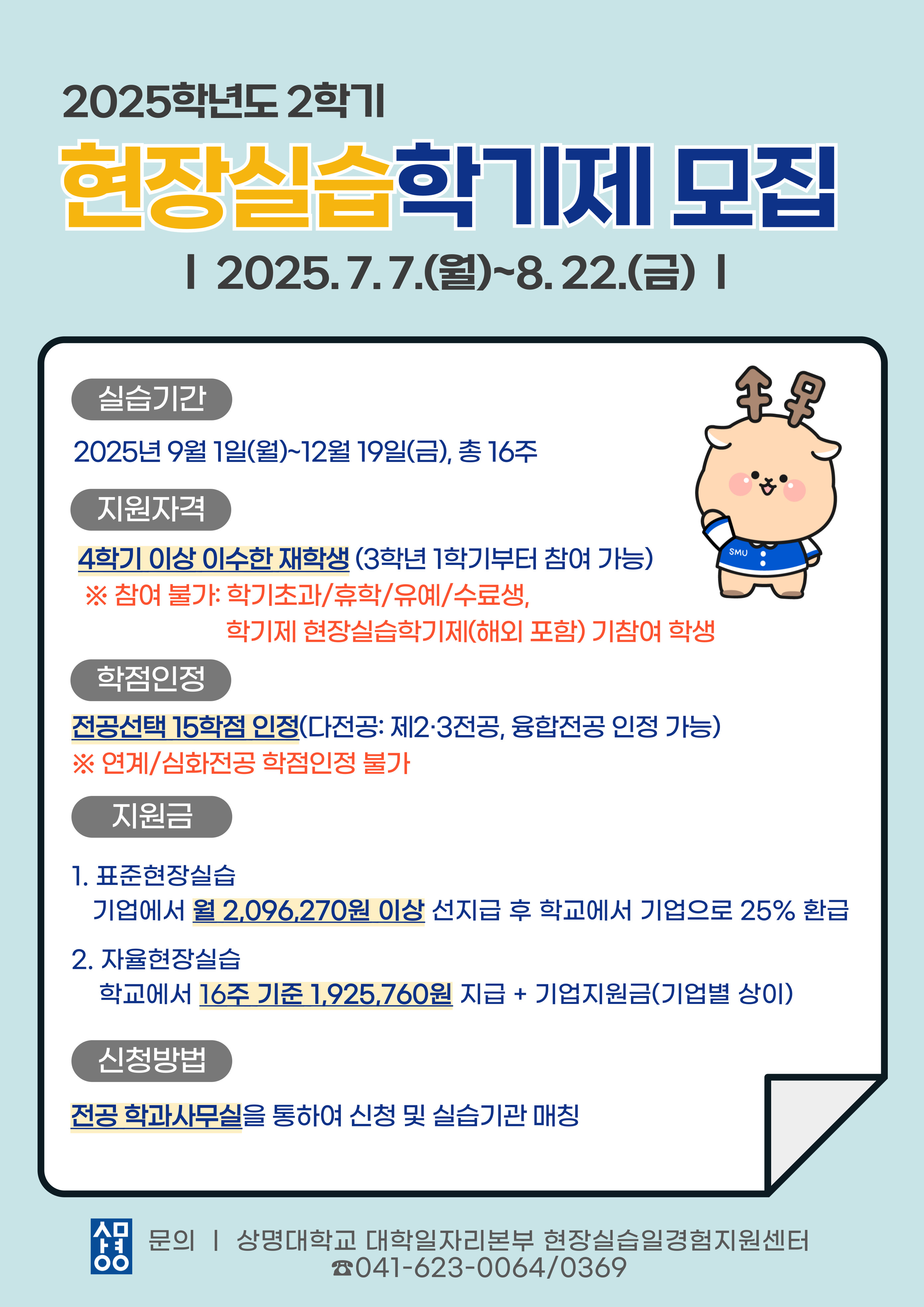 | 천안 [진로취업] | [현장실습·일경험지원팀] 2025학년도 2학기 현장실습학기제 시행 공고 |